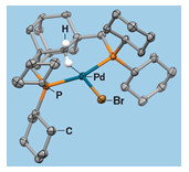 This X-ray structure of a model complex created by Demyan Prokopchuk’s lab illuminates how palladium (blue) interacts with hydrogen (white) to facilitate C–H activation.