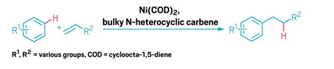 The current acylation and reduction methods to produce these compounds is through a Friedel-Crafts acylation, which requires multiple steps. The new reaction is the first to be done in one step, with approximately 50:1 linear to branched selectivity, Hartwig says. In addition, the catalyst, a nickel cycloocta-1,5-diene compound, could turn over 280 times and still give an 85% yield. This turnover is more than 10-fold higher than reac-tions involving catalytic hydroarylation of benzene, Hartwig says.