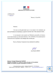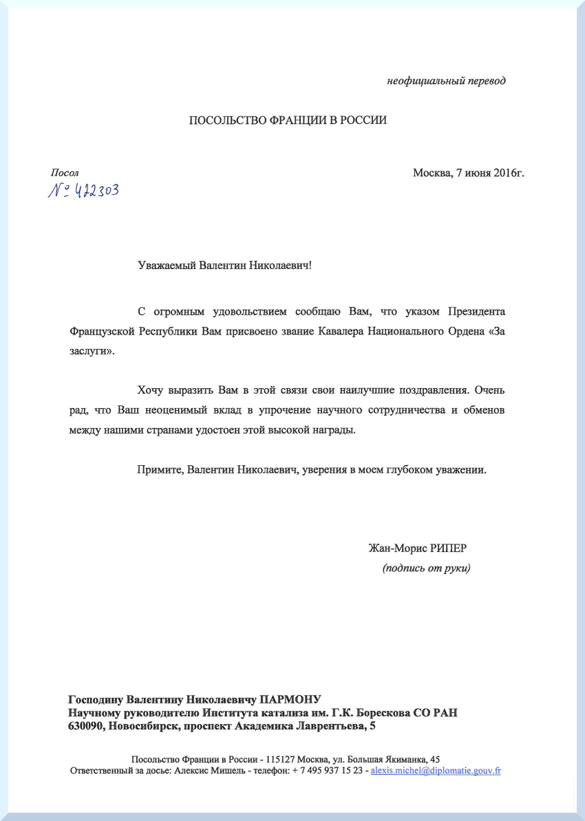 Научный руководитель Института катализа СО РАН академик Валентин Николаевич Пармон Указом Президента Франции Франсуа Олланда удостоен высокой государственной награды Французской Республики - почетного звания Кавалера Национального Ордена «За заслуги». Об этом в своем письме новому Кавалеру Ордена сообщил Посол Франции в Российской Федерации, господин Жан-Морис Рипер (фр. Jean-Maurice Ripert). Посол высказал свои поздравления и отметил «неоценимый вклад» Валентина Николаевича Пармона «в упрочение научного сотрудничества и обменов между нашими странами» .