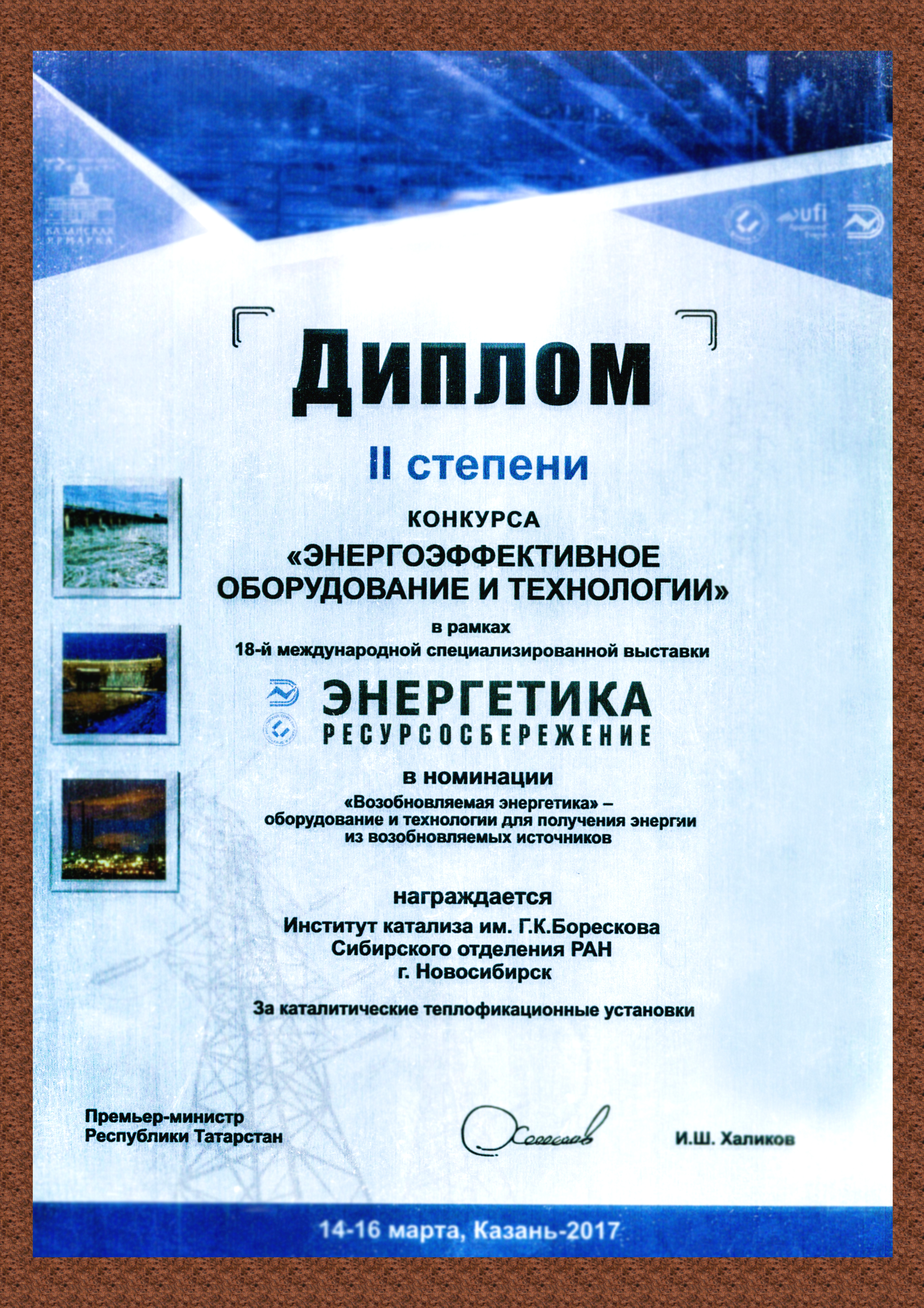 Более того, каталитические теплофикационные установки были отмечены престижным Дипломом II степени в ежегодном конкурсе «Энергоэффективное оборудование и технологии» в рамках 18-й международной специализированной выставки «Энергетика. Ресурсосбережение» в Казани. Эта выставка считается одним из ведущих мероприятий энергетической тематики в России и СНГ. Диплом вручен в номинации «Возобновляемая энергетика».