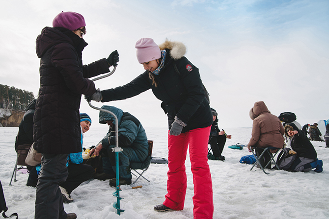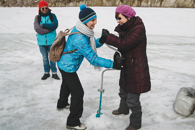 Девушки бурили лунки парами. Участники спешили поскорее закинуть удочку, чтобы получить награду в одной из разыгрываемых номинаций.