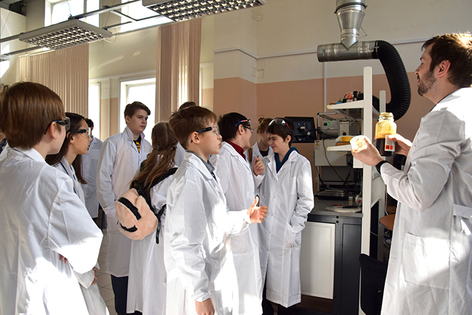 Третью остановку сделали в корпусе новых технологий в лабораториях, занимающихся исследованиями в области нефтепереработки и возобновляемых источников энергии. Ребята смогли посмотреть, как выглядят современные катализаторы нефтепереработки, ощутить аромат бионефти и прикоснуться к реактору кипящего слоя.