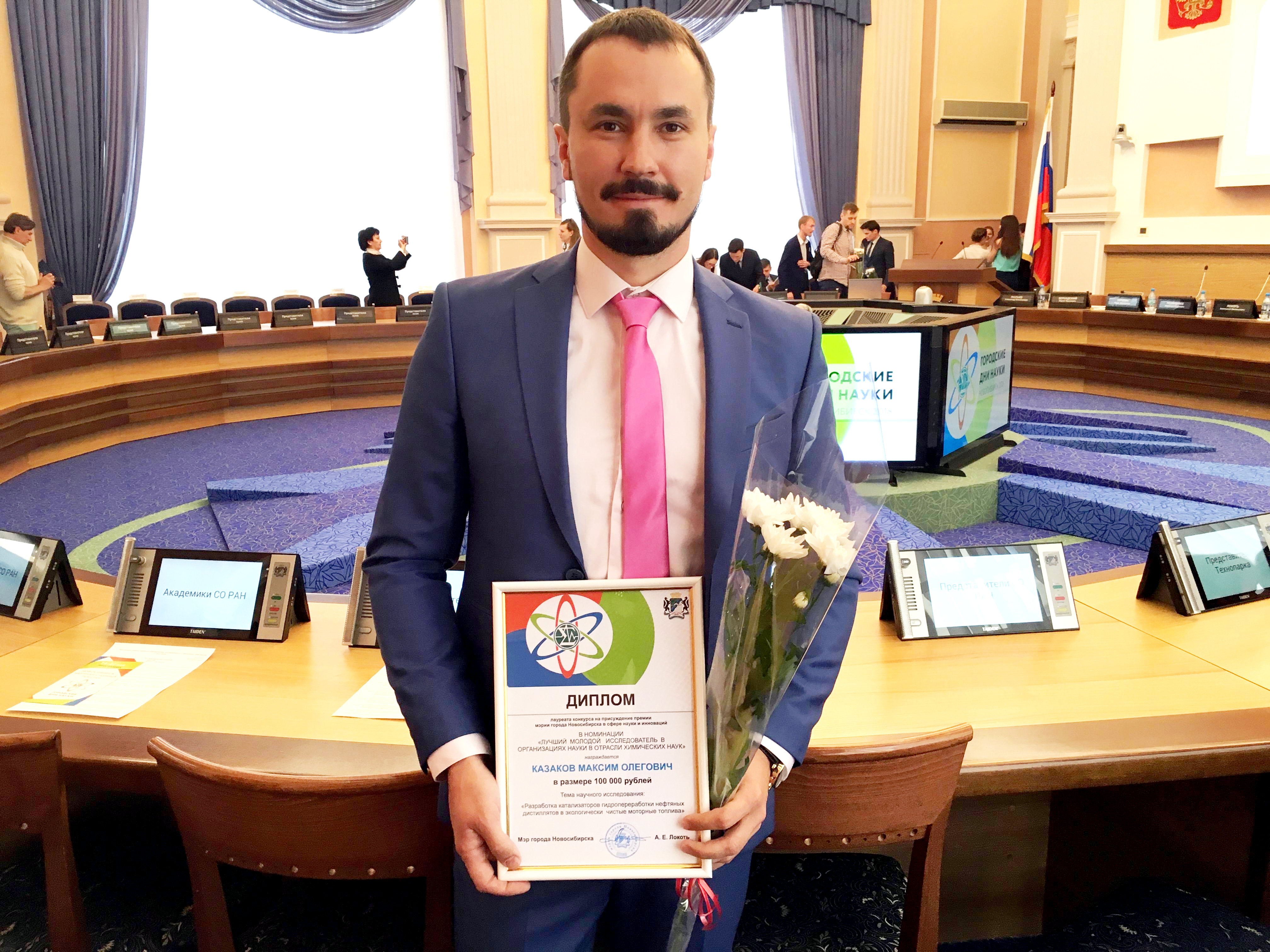 17 мая на торжественном мероприятии, посвященном Городскому дню науки, мэр города Анатолий Евгеньевич Локоть вручил дипломы лауреатов 14 молодым исследователям из академических институтов Новосибирского научного центра СО РАН, победившим в конкурсе премий мэрии Новосибирска в сфере науки и инноваций. В числе победителей конкурса - старший научный сотрудник Лаборатории нестационарных каталитических методов очистки газов ИК СО РАН кандидат химических наук Максим Олегович Казаков.