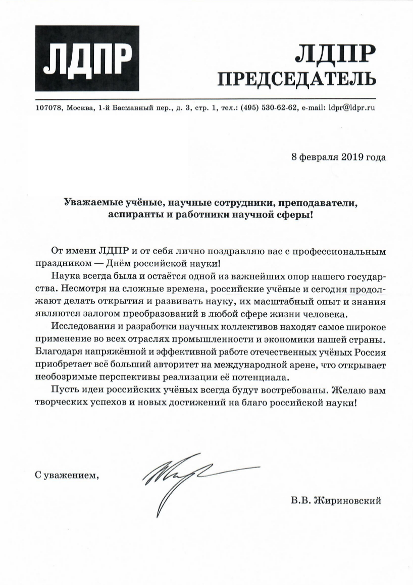 В день основания Российской академии наук, 8 февраля, отмечается День российской науки. В связи с этим, в адрес Института катализа СО РАН пришло поздравление от председателя ЛДПР Владимира Жириновского: