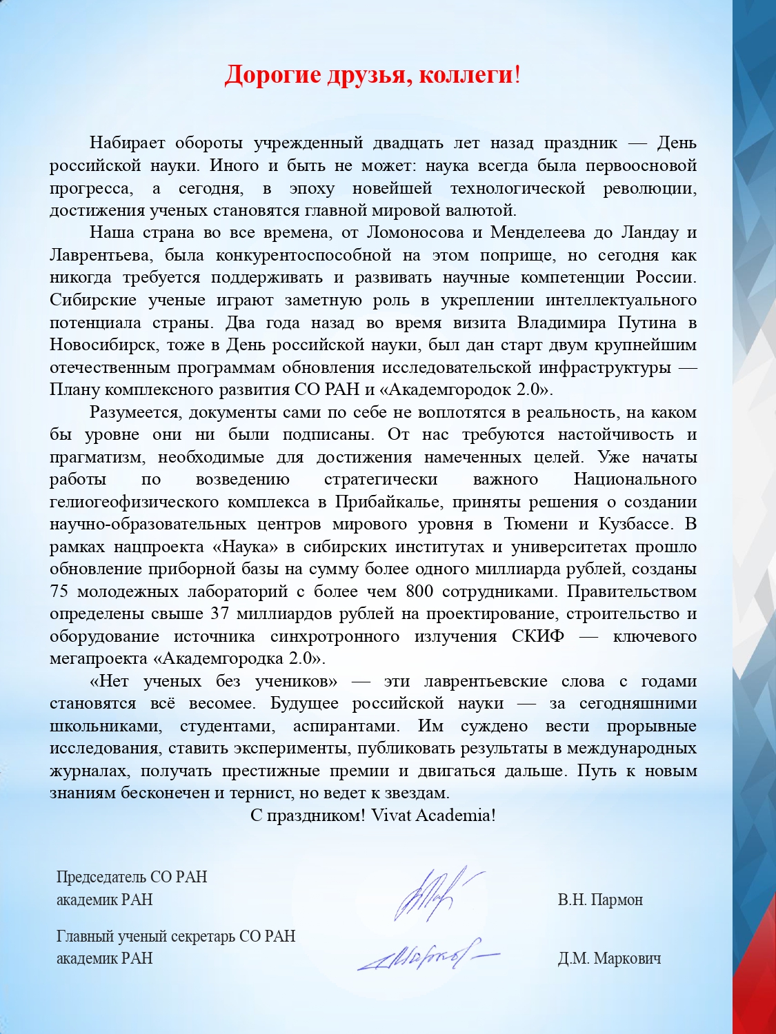 Поздравление от руководства Сибирского отделения РАН с Днем российской науки